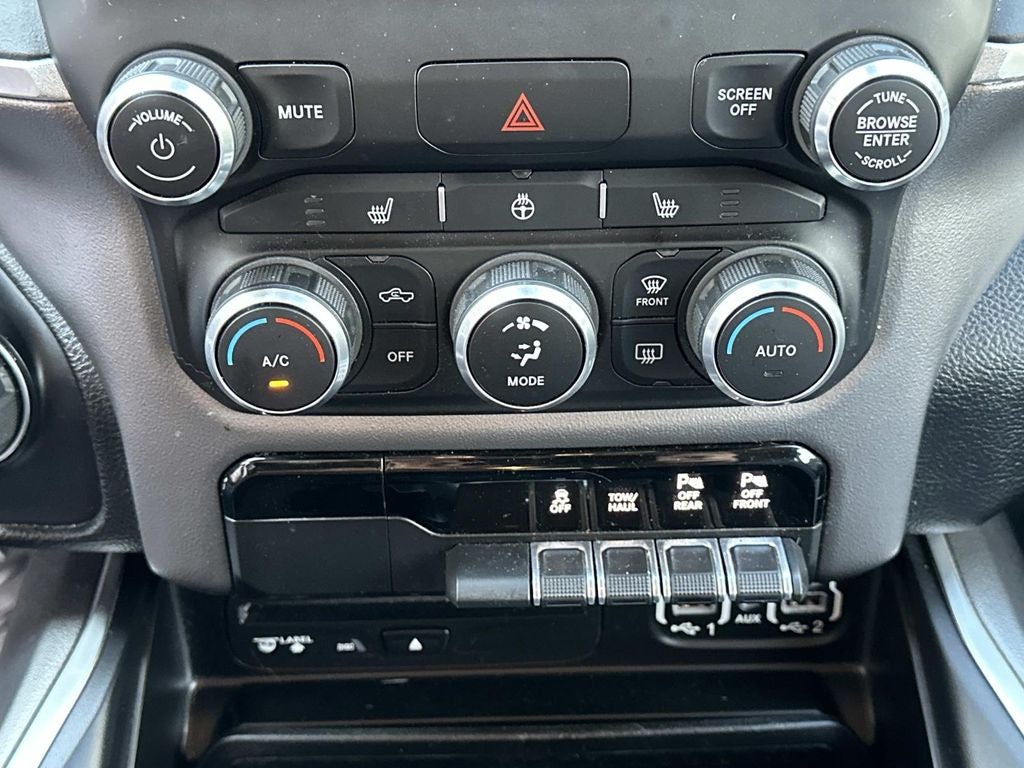 Big Horn Level 2 Equipment Group (115V Auxiliary Power Outlet, 115V Auxiliary Rear Power Outlet, 2 USB Full Function/Charge Only Media Hub, 400W Inverter, 8.4 Touchscreen Display, Air Conditioning ATC w/Dual Zone Control, Auto-Dimming Rear-View Mirror, Big Horn IP Badge, Class IV Receiver Hitch, Cluster 7.0 TFT Color Display, Dampened Tailgate, Foam Bottle Insert (Door Trim Panel), Glove Box Lamp, Heated Front Seats, Heated Steering Wheel, Integrated Center Stack Radio, ParkSense Front/Rear Park Assist w/Stop, Power 4-Way Driver Lumbar Adjust, Power 8-Way Driver Seat, Power Adjustable Pedals, Power Heated Fold Away Mirrors, Radio: Uconnect 4 w/8.4 Display, Rear Dome w/On/Off Switch Lamp, Rear Power Sliding Window, Rear Window Defroster, Remote Start System, Security Alarm, Single Disc Remote CD Player, SiriusXM Satellite Radio, Sun Visors w/Illuminated Vanity Mirrors, and Universal Garage Door Opener), Quick Order Package 25Z Big Horn/Lone Star (Steering Wheel Mounted Audio Controls), 3 Rear Seat Head Restraints, 3.21 Rear Axle Ratio, 4 Way Front Headrests, 4-Wheel Disc Brakes, 48V Belt Starter Generator, 6 Speakers, ABS brakes, Air Conditioning, Alloy wheels, AM/FM radio, Brake assist, Bumpers: chrome, Cloth Bench Seat, Compass, Delay-off headlights, Driver door bin, Dual front impact airbags, Dual front side impact airbags, Electronic Stability Control, Front anti-roll bar, Front Center Armrest w/Storage, Front fog lights, Front reading lights, Front Seat Back Map Pockets, Front wheel independent suspension, Fully automatic headlights, GPS Antenna Input, Heated door mirrors, Illuminated entry, Leather steering wheel, Low tire pressure warning, Manufacturer's Statement of Origin, Occupant sensing airbag, Outside temperature display, Overhead airbag, Overhead console, Panic alarm, ParkView Rear Back-Up Camera, Passenger door bin, Passenger vanity mirror, Power door mirrors, Power steering, Power windows, Radio data system, Radio: Uconnect 3 w/5 Display, Rear 60/40 Folding Seat, Rear anti-roll bar, Rear seat center armrest, Rear step bumper, Remote keyless entry, Speed control, Split folding rear seat, Tachometer, Telescoping steering wheel, Tilt steering wheel, Traction control, Trip computer, Variably intermittent wipers, Voltmeter, and Wheels: 18 x 8